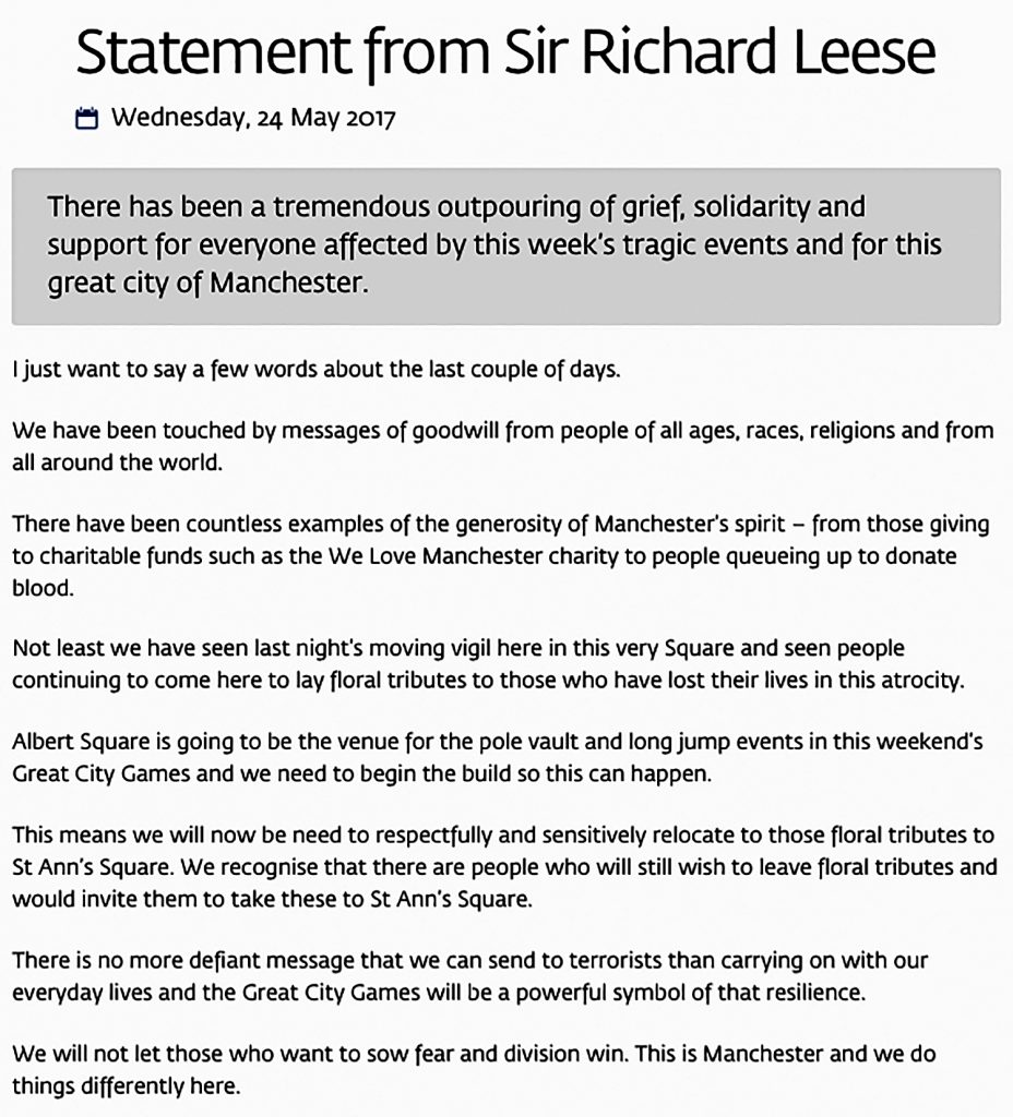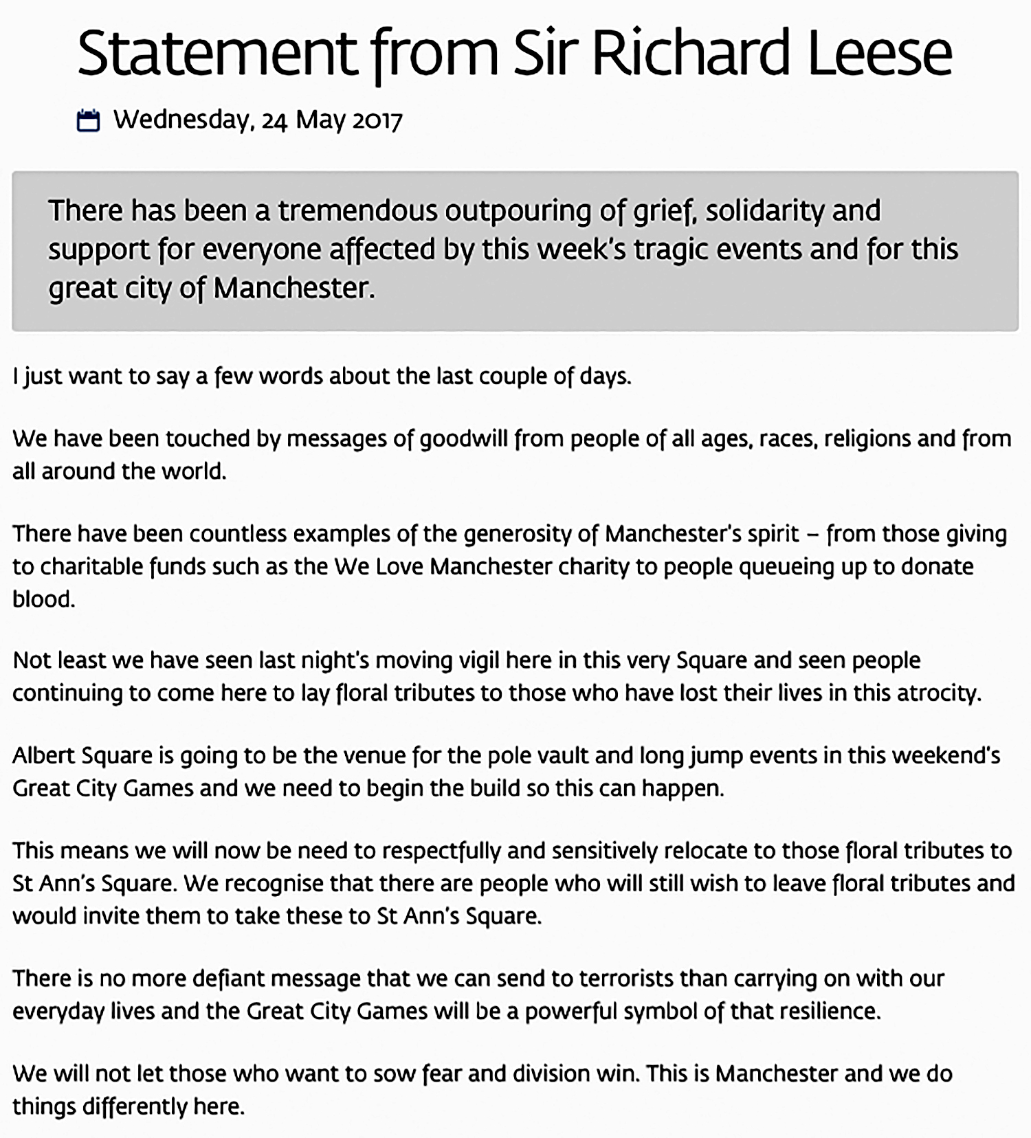 Veröffentlicht 24. Mai 2017 http://www.manchester.gov.uk/news/article/7689/statement_from_sir_richard_leese Kategorien:ALL DESIGNERS DIGEST ARTICLES Vorheriger Beitrag FAI DA TE… Nächster Beitrag TEARDROPS ON THE ROAD…