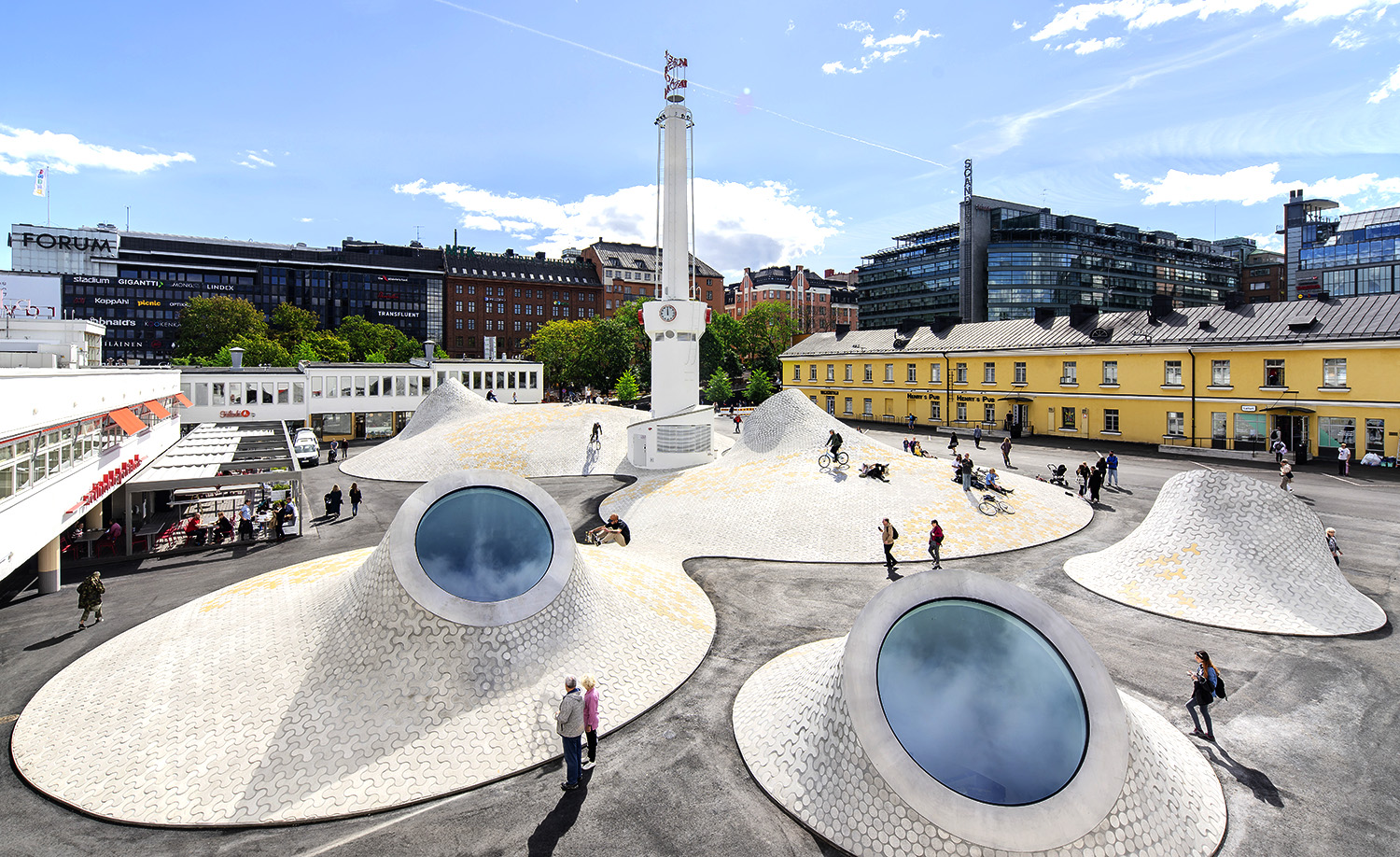 Fünfzig Millionen Euro wurden investiert, um das kulturelle Zentrum Helsinki’s um eine Attraktion zu erweitern. Ausgangspunkt war das Lasipalatsi Gebäude aus den Dreissiger-Jahren, eine architektonische Landmark im Zentrum der Stadt. Das Architekturbüro JKMM erhielt die Tradition, schuf einen zusätzlichen Museum-Raum für Projekte der Museums-Gesellschaft Amos Rex und darüber einen Platz für Helsinki’s Bürger. Das Projekt ist die neueste Ergänzung im Kultur-Quartier der Stadt. Mit dem Kiasma Museum of Contemporary Art, dem Helsinki Music Centre, Alvar Aalto’s Finlandia Hall, dem National Museum of Finland, dem Finnish Museum of Natural History, dem Ateneum Museum, Helsinki Art Museum (HAM) und der noch im Bau befindlichen Oodi Central Library soll die Stadt zu einem Kulturzentrum mit weltweiter Ausstrahlung werden.