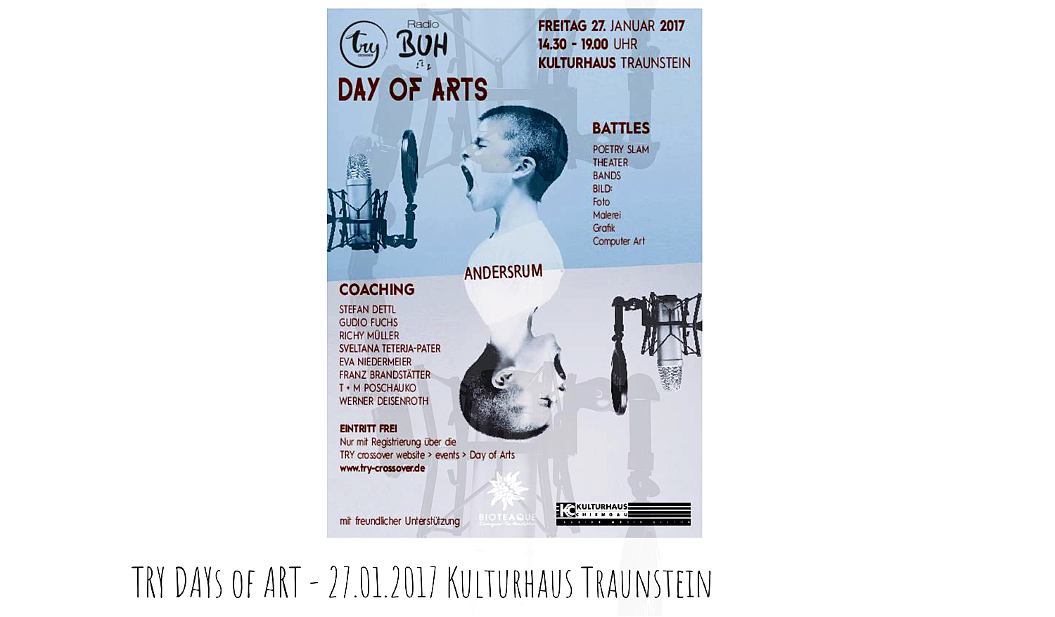 Aktueller Anlass für diesen Report ist das Finale des Projekts DAYS OF ART. Gut 100 Schüler aus der Region Traunstein waren dabei. Aufgeteilt in die Disziplinen Poetry-Slam, Theater, Bands und Bild (Malerei, Grafik, Computer-Art und Fotografie). Zwar ging es auch um erste Preise in den Wettbewerben. ‚Gewonnen’ haben letztlich alle, die an diesem Projekt teilgenommen haben. Denn es ging und geht um die Motivation, einen Leit-Satz von TRY-crossover zu verfolgen: ‚Deine Neugier und Deine Fantasie sind der größte Schatz, den Du im Leben hast. Darum geben wir Dir die Möglichkeit, Deine Talente zu leben.’