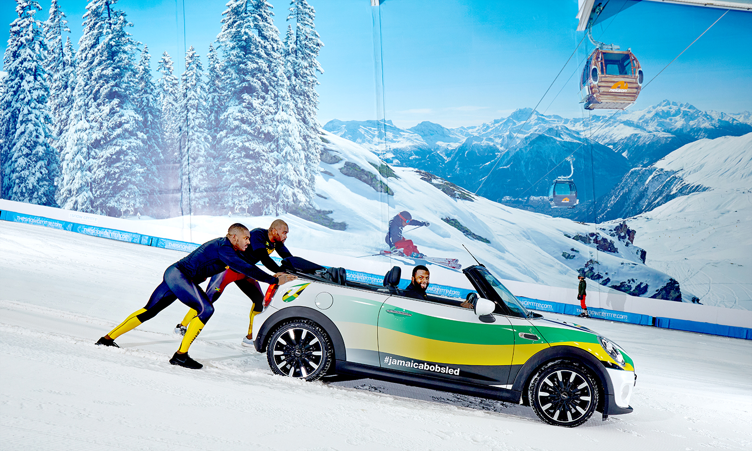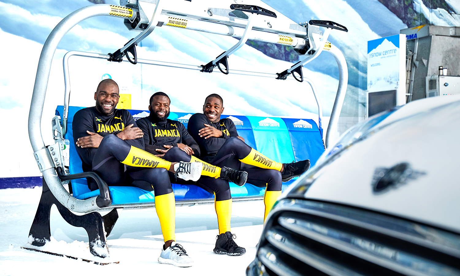 Also für Bob-Bahnen ist Jamaica nicht bekannt. Aber für Menschen mit Sportsgeist. Das Jamaica-Bob-Team bereitet sich auf die Qualifikation für die Winterspiele 2022 in Peking vor. Nur hatten Bob-Pilot Shanwayne Stephens und seine Besatzung Dy’Neal Fe’ssal, Matthew Wilson und Nimroy Turgott ein Problem, das so gut wie alle auf der Welt haben. Corona heißt es. Training und Teambuilding mit den zwei Neuen Männern im Bob, Dy’Neal und Matthew, brauchte ein alternatives Setting. Also zogen sie in den artificial Winter in Großbritanniens größter Indoor-Skipiste, das Snow Centre in Hemel Hampstead. Und mit ausdrücklicher Zustimmung von MINI taten sie etwas, was ein MINI normalerweise wirklich nicht braucht: Anschieben. Sportsgeist, very British, very MINI…