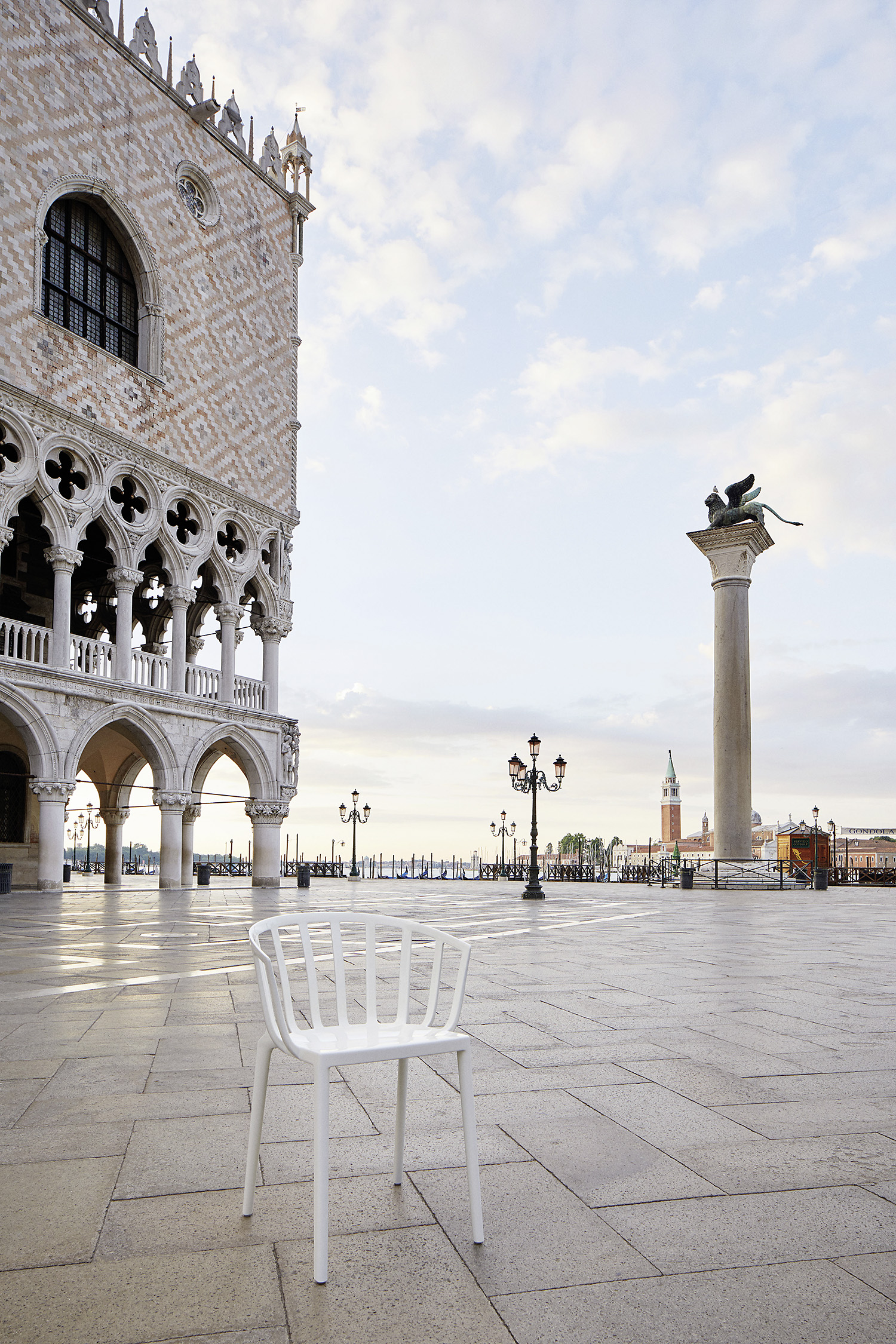 Zeit ist kein Maßstab in Venedig. Sie bleibt dort stehen und zugleich weckt die Stadt Wehmut, weil niemand sich dem Lauf der Dinge entziehen kann. Modern und Neu sind nicht die Begriffe für den Fluss der Dinge. Die Stadt toleriert, dass das Vergängliche oder Vergangene durch den Beginn von Anderem seine Fortsetzung findet. KARTELL fügt sich in diesen Gegensatz von Zeitlosigkeit und Vergänglichkeit ein. Zeigt Stücke seiner Kollektion nicht vor der Kulisse, sondern als Bestandteile eines Ortes mit Magie…
