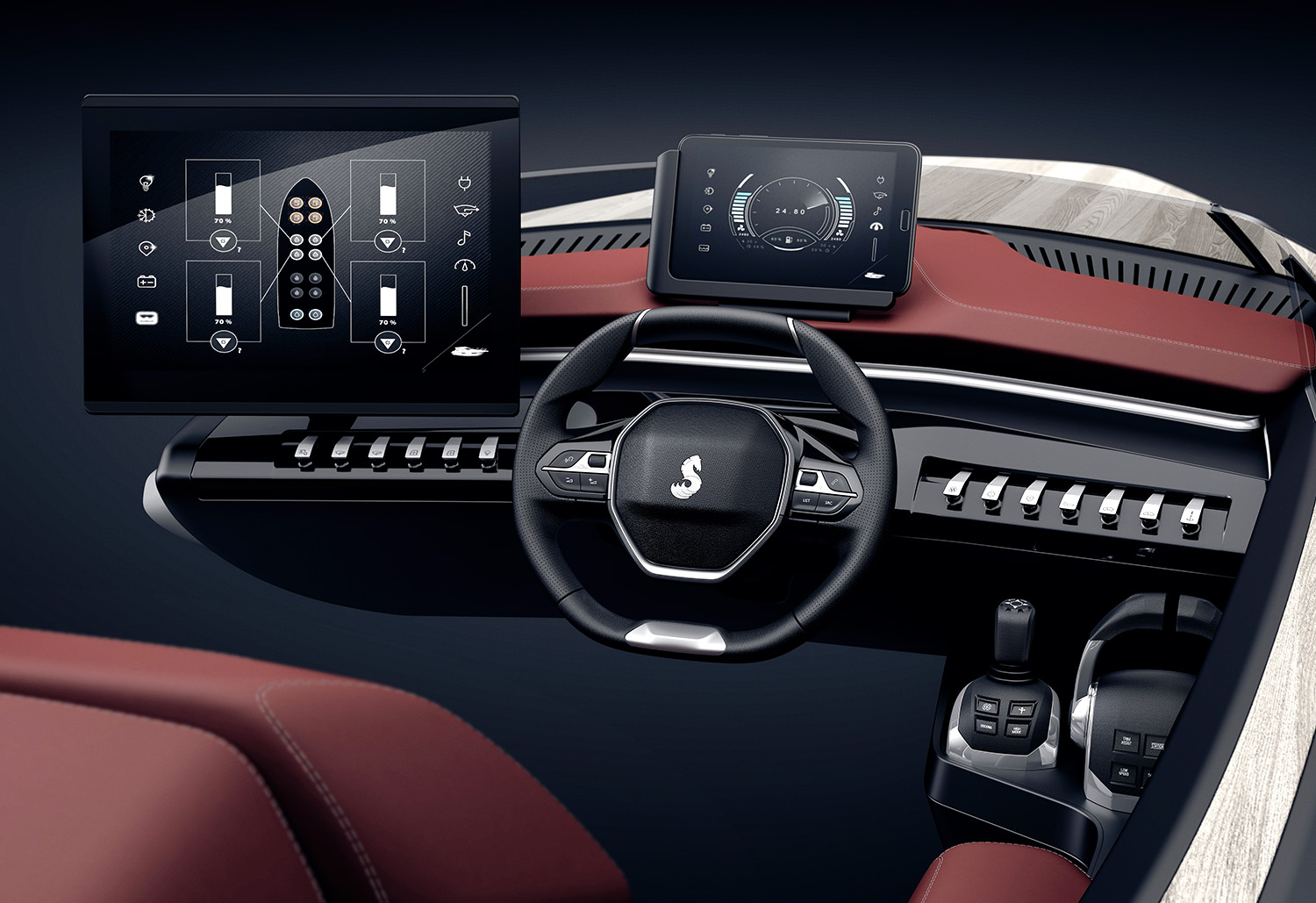 So sehen die Armaturentafeln heute aus. Hoch platzierte Hauptinstrumente bringen die Informationen in das Fahrer-Blickfeld, ein großer Touchscreen als Interaktions-Modul für die Bedienung von Komfortfunktionen und die Steuerung oder Kontrolle der Fahrzeugfunktionen. Wenige Bedienknöpfe, sorgsam gewähltes Material und hochwertige Verarbeitung, ergänzt durch ein kompaktes Lenkrad zur Steigerung der Wendigkeit und zur Verbesserung des Fahrgefühls. Kurz zusammengefasst ist das die Charakterisierung der Cockpit-Philosophie von Peugeot. Umgesetzt im Peugeot-i-Cockpit, das bisher in rund vier Millionen Fahrzeugen zu finden ist. Die Fortführung dieser Konzeption führt zum INSTINCT CONCEPT, dessen RESPONSIVE i-COCKPIT den Fahrzeuginnenraum neu definieren wird. Schiff Ahoi, jetzt kommt die ‚richtige’ Geschichte: Peugeot Design Lab, 2012 gegründet, entwickelt Lösungen für externe Auftraggeber. So ist ein Transfer der Automobil-Designkompetenz in andere Anwendungsbereiche möglich. Von den Kapitänen der Landstraße zum Beispiel zu den Schiffs-Kapitänen. Die Prinzipien sind vergleichbar. Alle wesentlichen Informationen müssen im Blickfeld sein und die Bedienung der Peripherie-Funktionen soll organisch vorgenommen werden können. Benetau, Frankreichs traditioneller Hersteller von Yachten und Booten, hat nun zusammen mit Peugeot das maritime Bord-Kontroll-Konzept für morgen entwickelt. Vom Bootsbau kommt das Advanced Monitoring System mit den relevanten Steuerfunktionen für den Schiffsbetrieb. Von der ‚Auto-Seite’ ergänzt um die Informations-, Bedienungs- und Gestaltungs-Merkmale. Ship Control und das Sea Drive Concept von Peugeot Design Lab sollen zusammen unter Beweis stellen, dass das Fahren auch auf dem Wasser neu definiert werden wird.