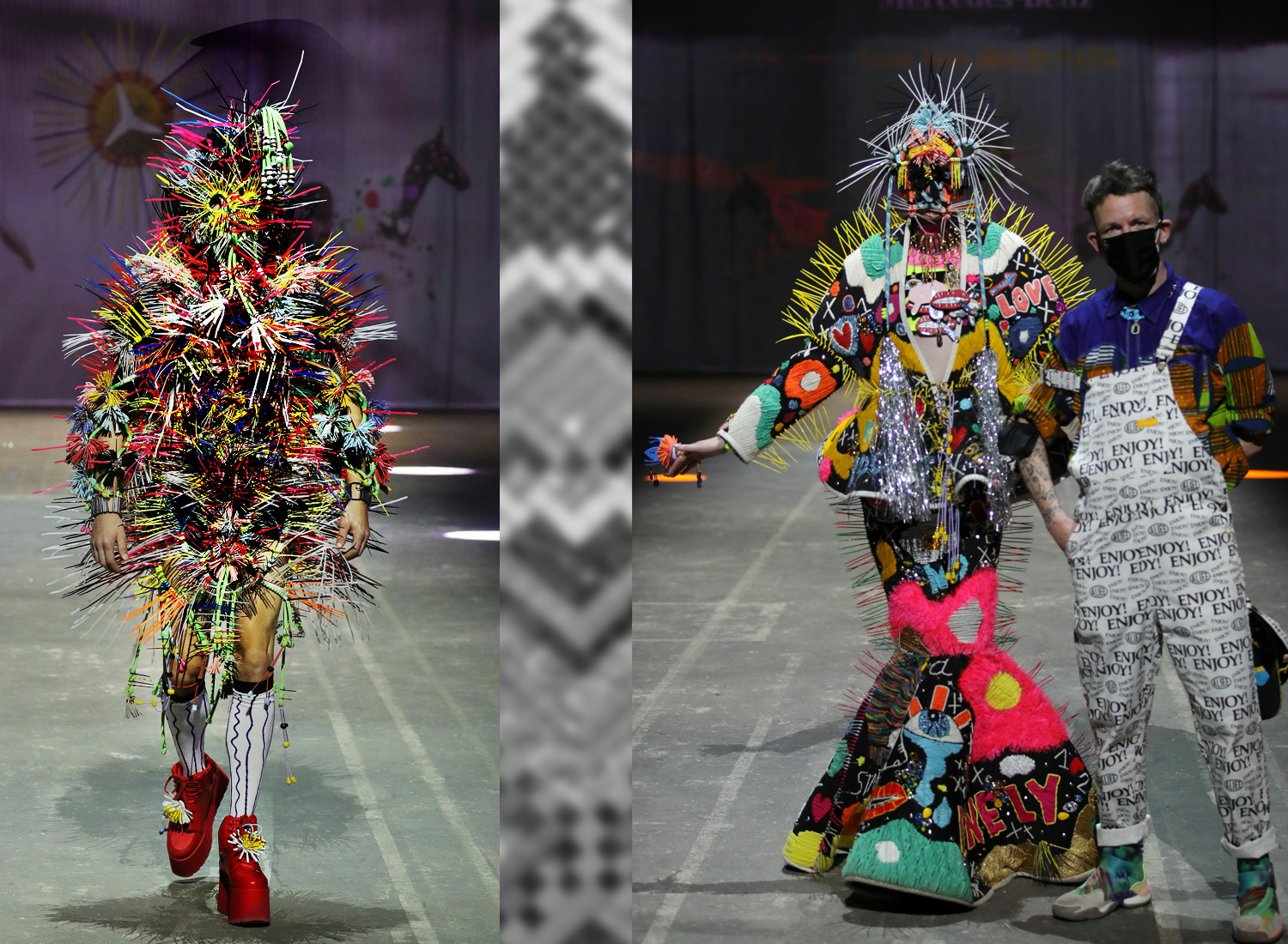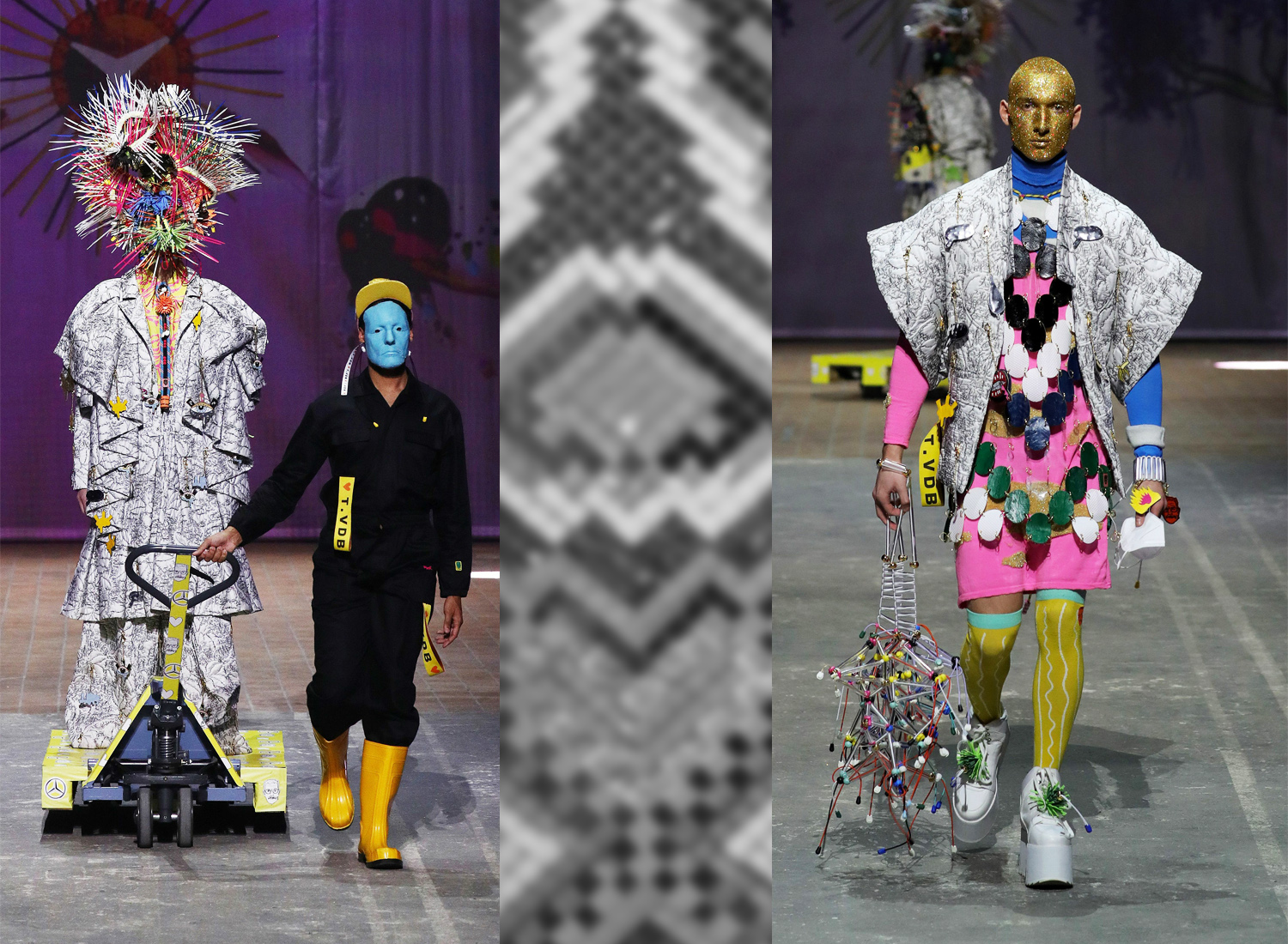 Opening der Mercedes Benz Fashion Week mit einer Show von Tom Van der Borght. Modekünstler und Fashion-Visionär. Die Headline ist ein Zitat von ihm. Sie kann als Konzentrat seiner Haltung verstanden werden: Suche nach einem neuen Weg harmonischen Zusammenlebens zwischen den Menschen und mit dem Planeten Erde. Abzuschalten sind alte Gewohnheiten und Rituale, auch die überkommenen Definitionen von Luxus. Mit seiner Kollektion will er die Existenzberechtigung des Nonkonformismus betonen, übersetzt in eine Vision für einen zeitgenössischen Urban Tribe. Das geht einher mit seiner Forschung danach, was Luxus und Haute Couture in Zukunft sein können. Material bekommt einen anderen Stellenwert. Es ist nicht mehr das Rare und Teure, sondern das achtlos von Menschen Aussortierte. Er definiert Nachhaltigkeit nicht nur in der passiven Linie des wiederverwertbaren Materials. Er gibt nachlässig Weggelegtem neue inhaltliche Bedeutung. Sein Signal ist nicht ein Verweilen in der Tristesse des Verzichts, sondern Freude an der Diversität. Es braucht nur den Willen, die Denkmuster von gestern abzuschalten. ‚High-Tech Bricolage‘ als Titel der Kollektion reflektiert, was Claude Lévi-Strauss in die Anthropologie einführte: Ein Verhalten des Akteurs, bei dem er mit den verfügbaren Ressourcen Probleme löst, statt sich speziell für das Problem entworfene neue Mittel zu beschaffen. Mit seinem Label T.VDB verbindet der multidisziplinäre Künstler Tom Van der Borght vielschichtige Modeerlebnisse. Mit diesem Ansatz hat er im letzten Jahr die Jury des Festival Hyères überzeugt, die ihm den wichtigsten Modepreis des Festivals verlieh. Weil es darum ging, so die Jury, das Jahrzehnt mit Neuheit, Originalität zu beginnen…
